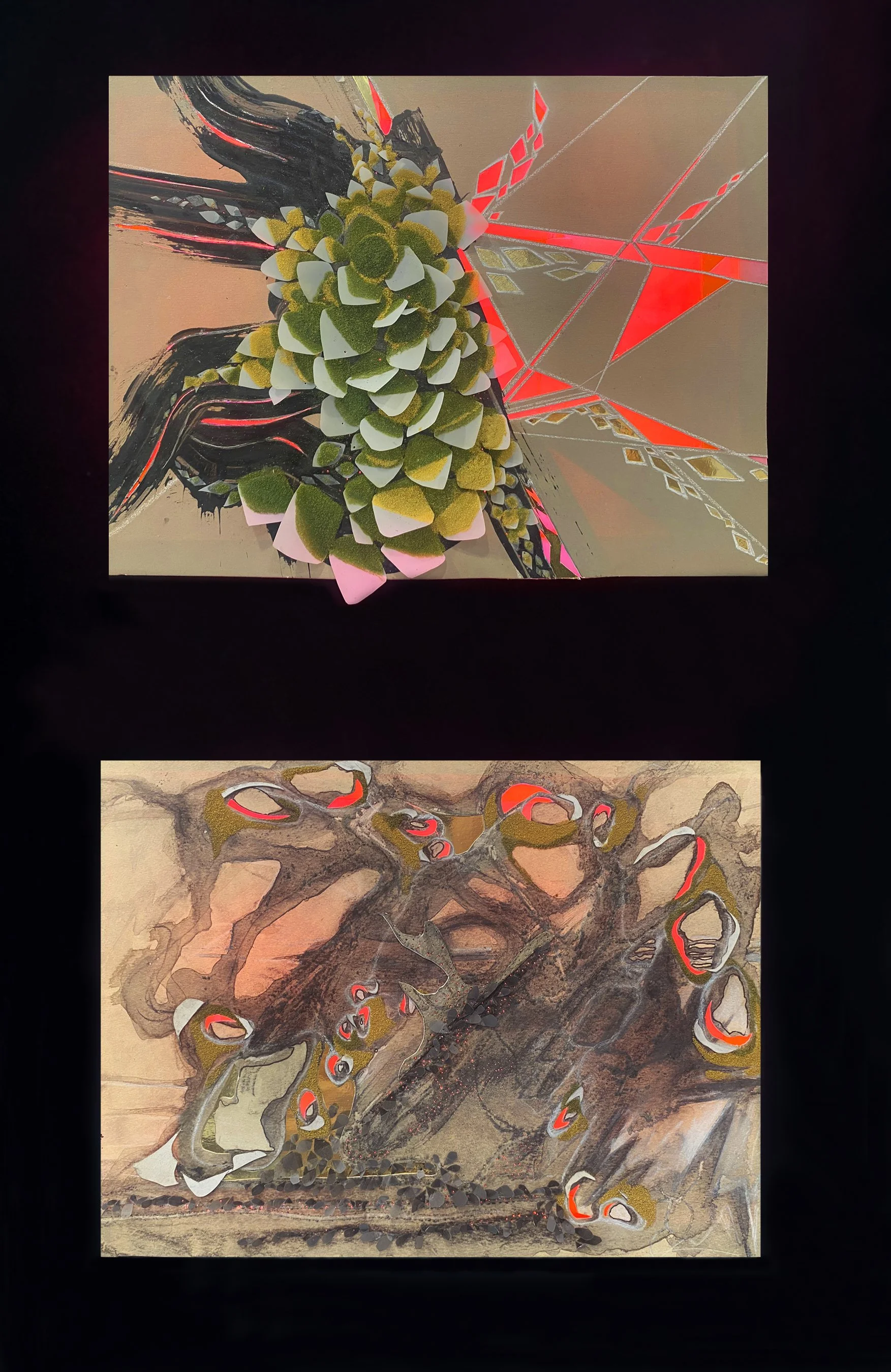 CEDAR WOOD VENEER, CHARCOAL, PASTEL PENCILS, MIRROR SHARDS, GLITTER, GLUE AND LEDS ON PLEXIGLASS, 4' H x 4' W x 2" D, 2025